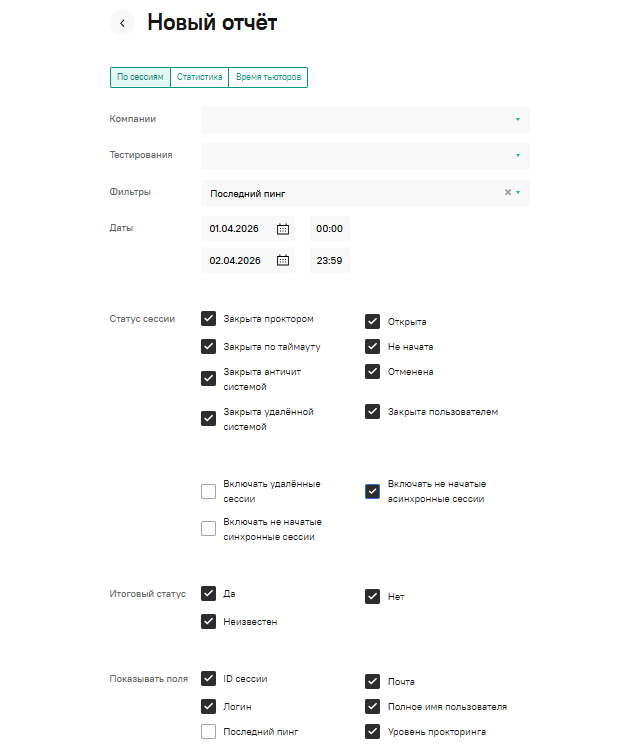 Настройка Включать не начатые Синхронные или Асинхронные сессии позволяет увидеть в отчете те сессии в которых пользователь по каким-то причинам не приступил непосредственно к самому тесту (Статус - Не начата).