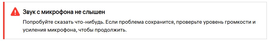 Во время проверки оборудования система считывает уровень громкости вашего микрофона. Если вы видите сообщение «Звук с микрофона не слышен», то попробуйте громко и чётко говорить в микрофон до окончания проверки оборудования.