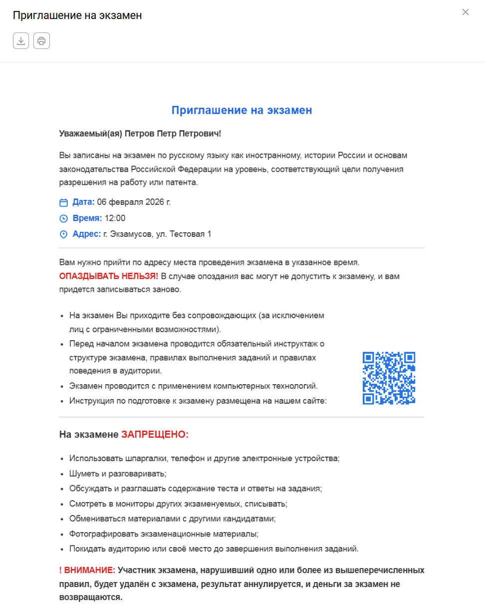 При неоходимости нажмите на кнопку Приглашение на экзамен, в результате вы получите информационный билет об экзамене для участника. Вы можете его отправить на почту или распечатать.