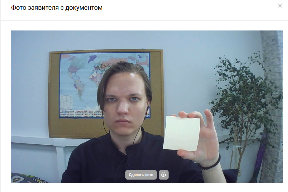 Сделайте фото заявителя с документом, удостоверяющим личность или загрузите фотографию с компьютера.