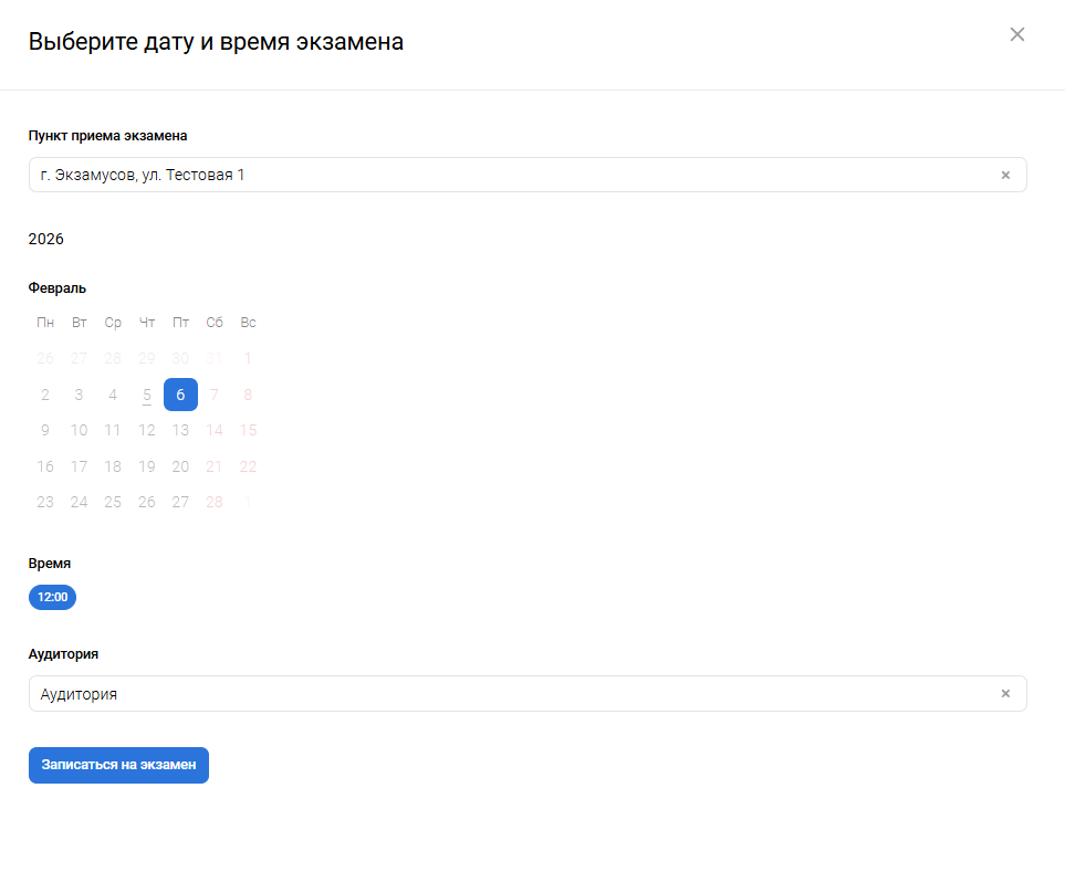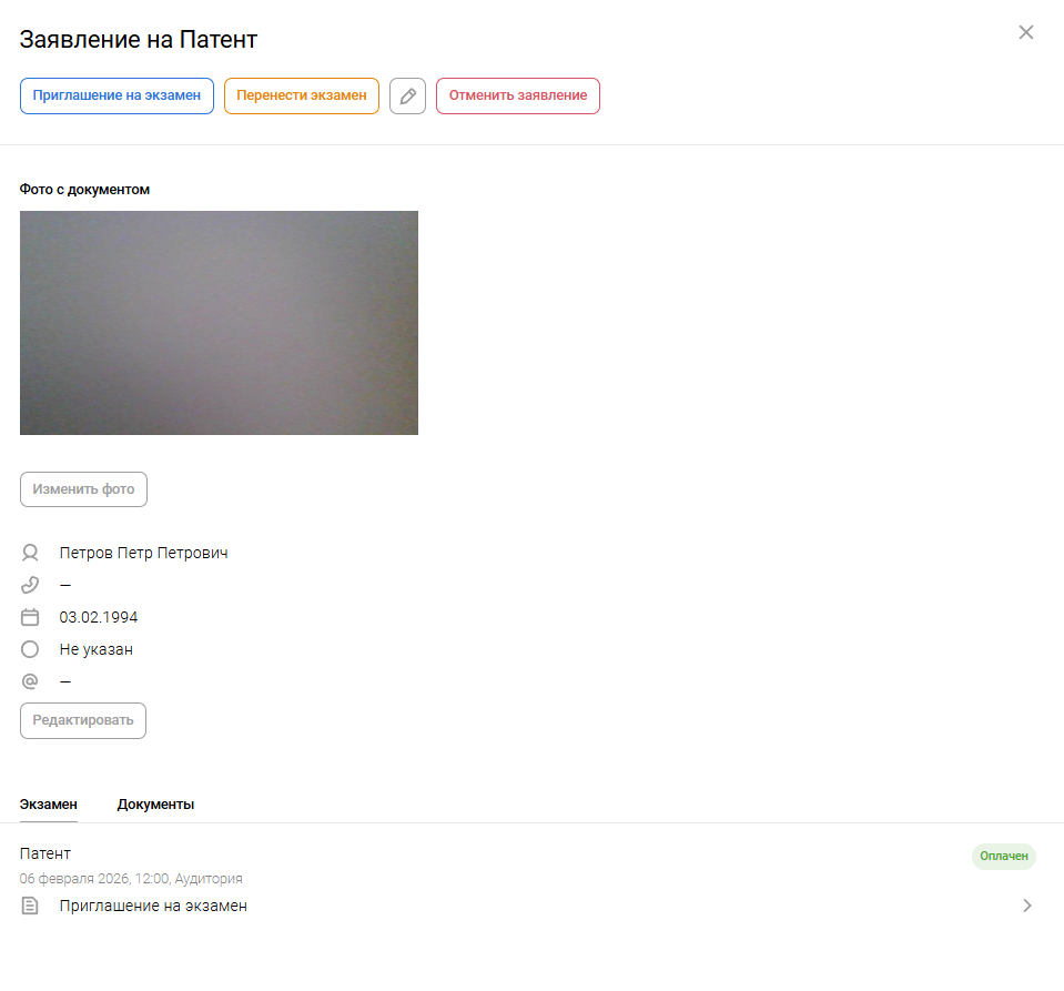 - Запишите тестируемого на экзамен. Вы можете отредактировать данные, перенести экзамен или отменить заявление по выбору данного пользователя.