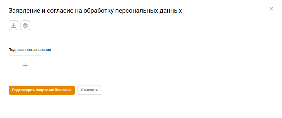 - Скачайте и выдайте на подпись согласие на обработку персональных данных. Подписанное согласие отсканируйте и загрузите в заявление, либо подтвердите получение без скана.